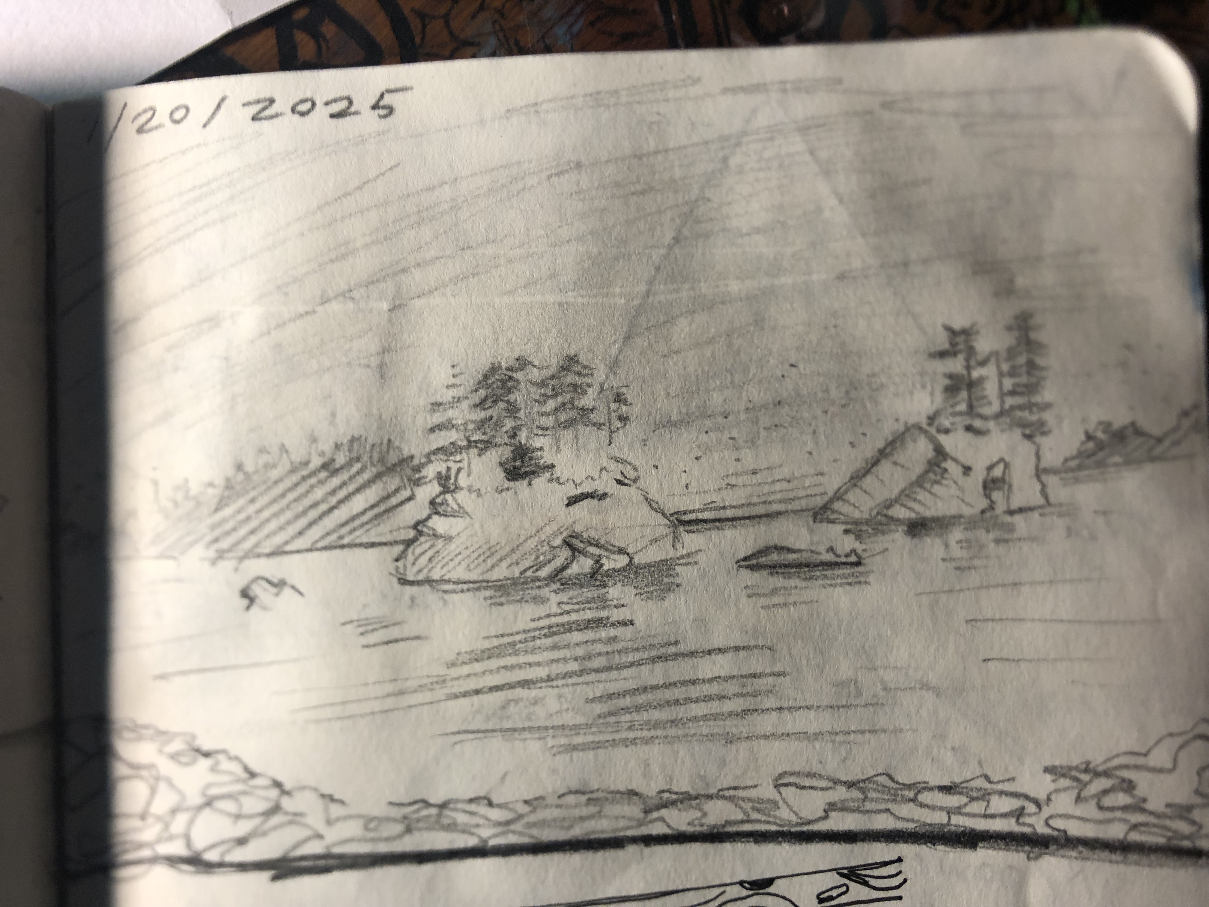 Though this art piece isn't notable for any new techniques or styles, it has a special place on my heart. I drew this landscape after taking hours to help set up a tarp at the field site I researched on in Alaska. My group got so lucky, we set up the tarp right before a flurry of rain hit us. Everything was soaked, except us under the tarp. My friends and I all took shelter under the tarp for a couple hours before our dinner was cooked, talking and drawing. This landscape was the bay I sawin front of us.