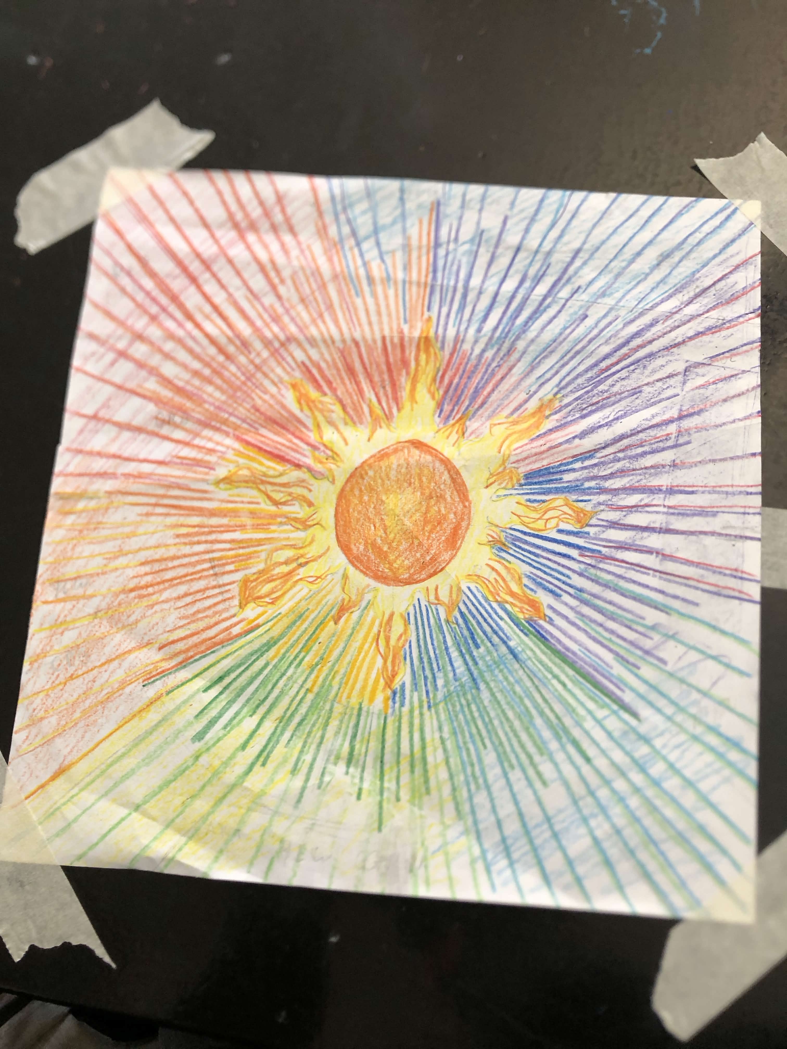 So as I learned in class, colors...there's more to em! Tools like color wheels take a more scientific approach to how you combine colors, mapping out colors based on primary, secondary, and tertiary colors. You may be wondering: this is neat and all, but why does this matter??? Have you ever been creating art, and all your colors clash?? Understanding the color wheel gives you the chance to solve this! Colors across from eachother on the color are complementary, meaning they contrast eachother, and will work well together. This is one example from the concept of color theory- which I encompass in my variety show poster section of my portfolio. But in all, color wheels are a handy tool!So making a color wheel, I wanted to accurately represent the color relations, but also get artsy and creative! I decided to base my color wheel off of where color all stems from...the sun!! Using blending techniques with colored pencils, I mimicked a color wheel in a way I can reference, and also view as pretty art! :> double whammy!